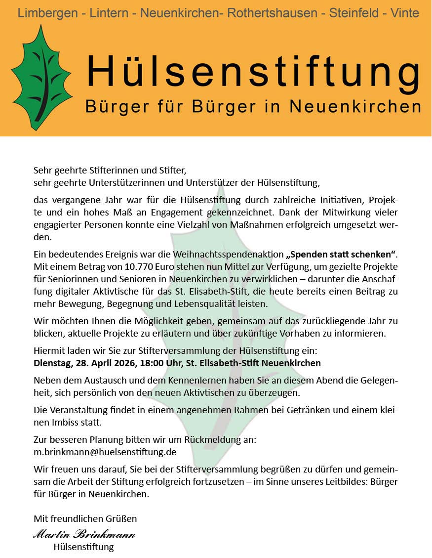 möchten wir sie informieren über die „Hülsenstiftung Bürger für Bürger in Neuenkirchen“.